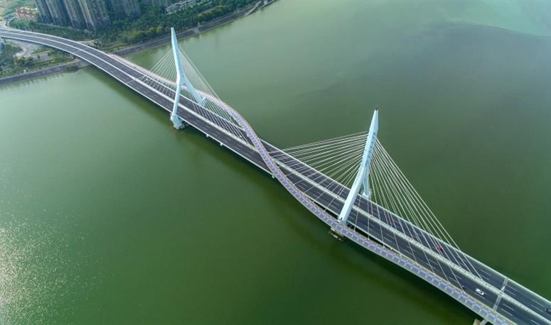 城南新区一号桥建成通车,,,,,,,有用地优化和改善了绵阳南区的交通结构,,,,,,,极大地缓解了中心城区的交通压力,,,,,,,从城东游仙区到城南新区不再绕行主城区,,,,,,,城东到城南将缩短5公里左右的旅程。。。。。。。。大桥在人行层飞架桥面上方,,,,,,,形成并不规则的“S”形,,,,,,,为全漂浮系统,,,,,,,建设手艺居天下领先职位。。。。。。。。