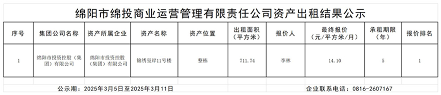 绵阳市BB电子·(china)有限公司官网商业运营治理有限责任公司资产出租效果公示