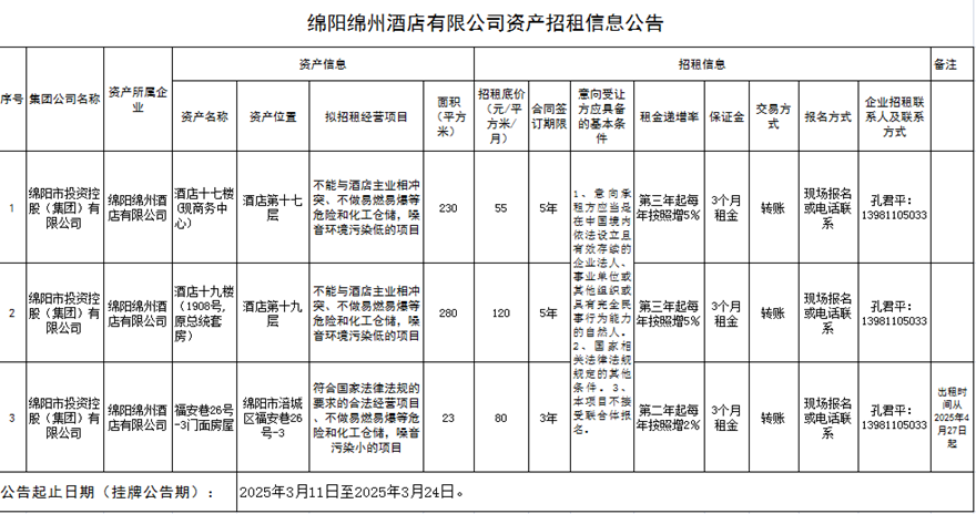 绵阳绵州旅馆有限公司资产招租信息通告