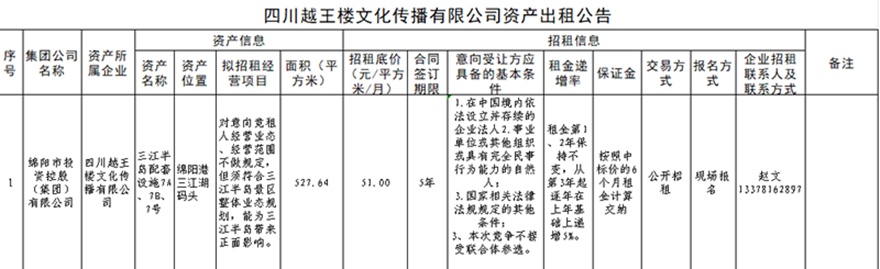 四川越王楼文化撒播有限公司资产出租通告