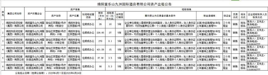 绵阳富乐山九洲国际旅馆有限公司资产出租通告