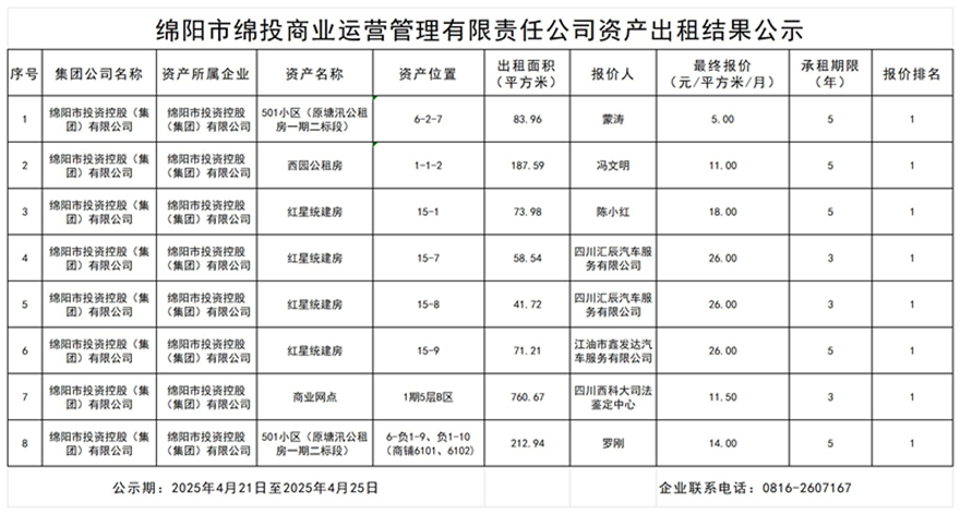 绵阳市BB电子·(china)有限公司官网商业运营治理有限责任公司资产出租效果公示