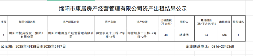 绵阳市康居房产谋划治理有限公司资产出租效果公示