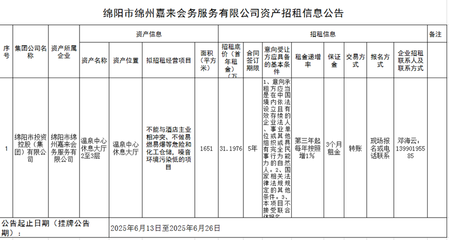 绵阳市绵州嘉来会务效劳有限公司资产招租信息通告