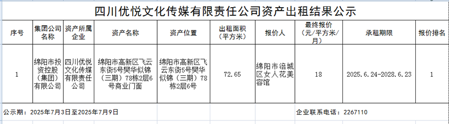 四川优悦传媒有限责任公司资产出租效果公示
