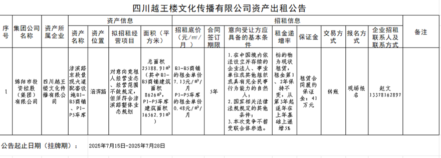 四川越王楼文化撒播有限公司资产出租通告