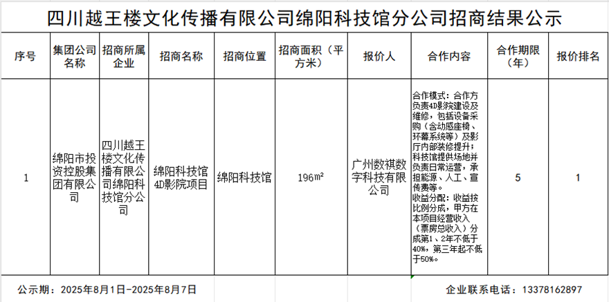 四川越王楼文化撒播有限公司绵阳科技城分公司招商效果公示