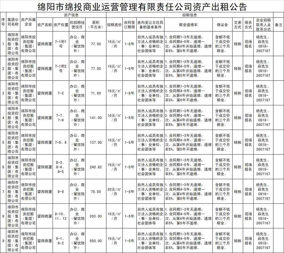 绵阳市BB电子·(china)有限公司官网商业运营治理有限责任公司资产出租通告