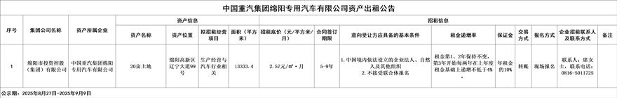 中国重汽集团绵阳专用汽车有限公司资产出租通告