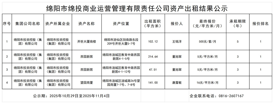 绵阳市BB电子·(china)有限公司官网商业运营治理有限责任公司资产出租效果公示