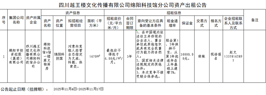 四川越王楼文化撒播有限公司绵阳科技馆分公司资产出租通告