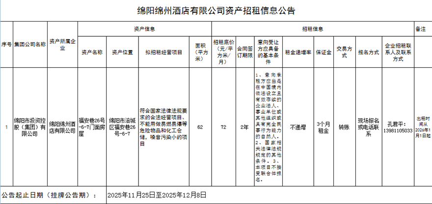 绵阳绵州旅馆有限公司资产招租信息通告