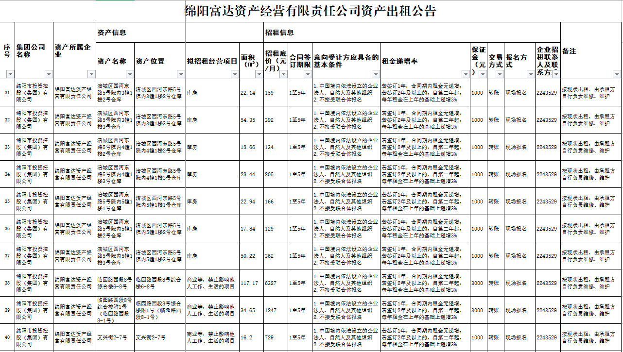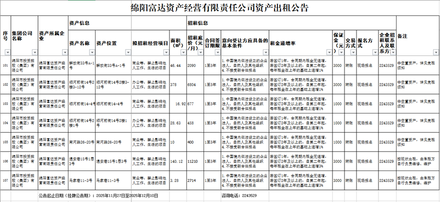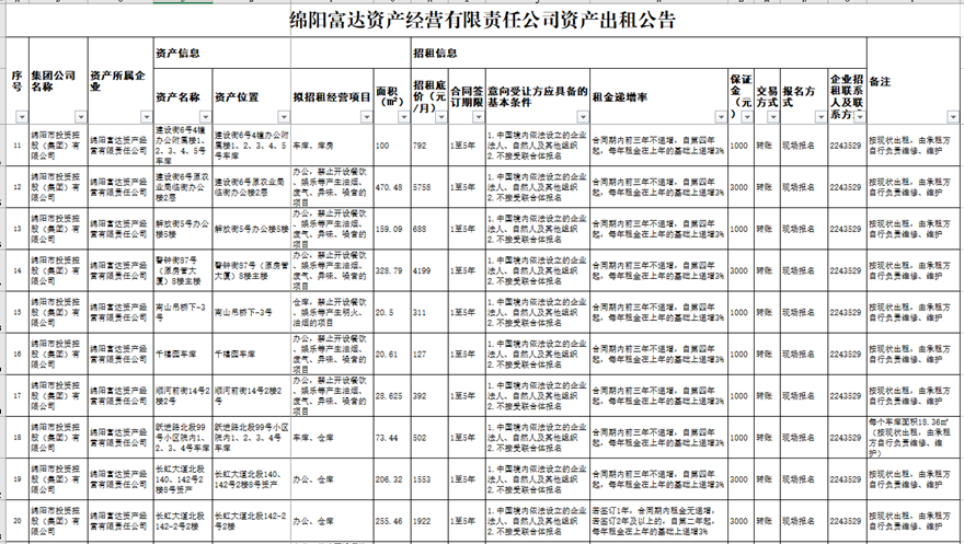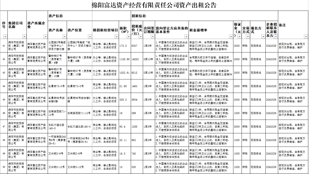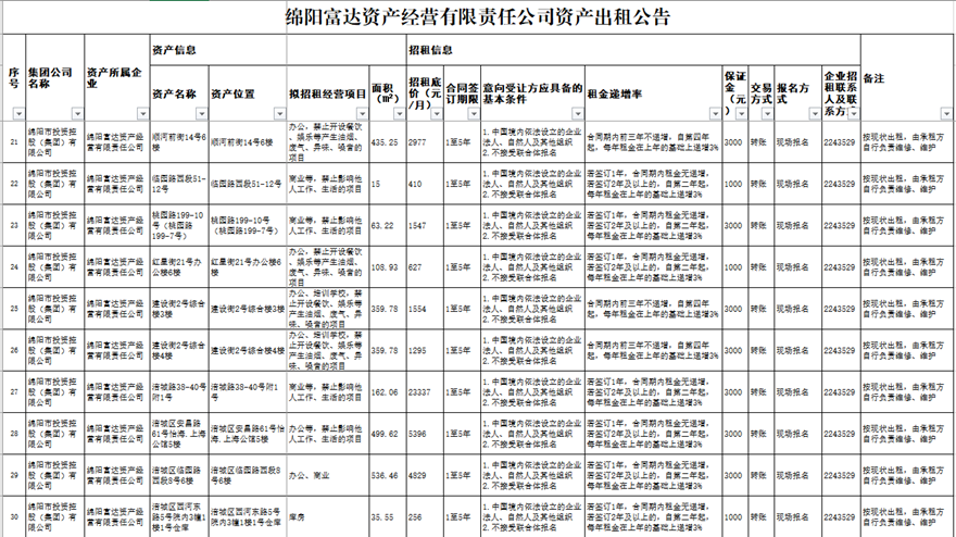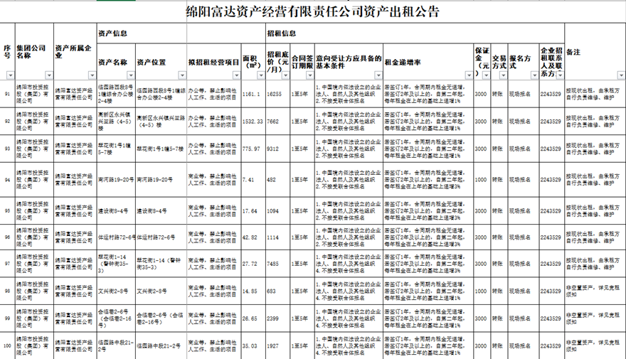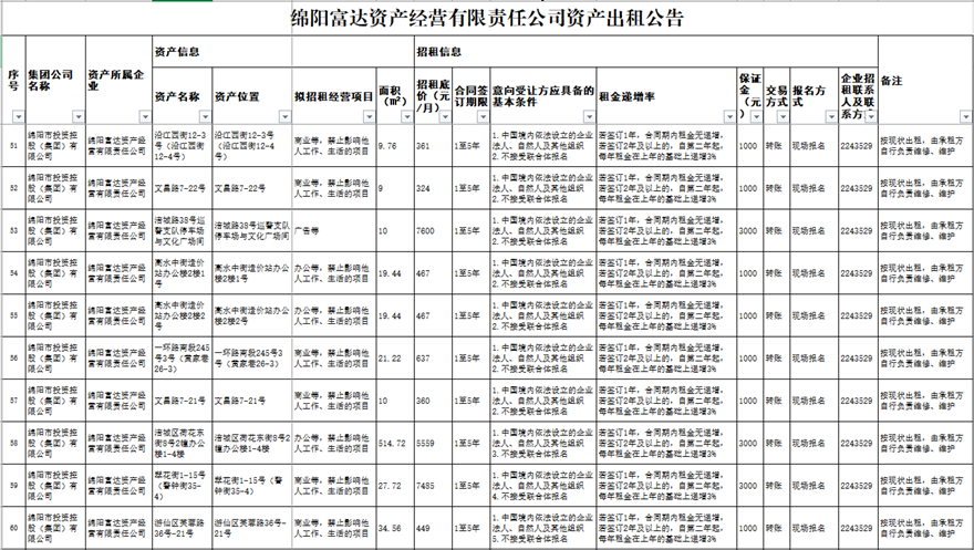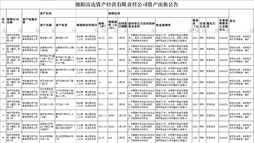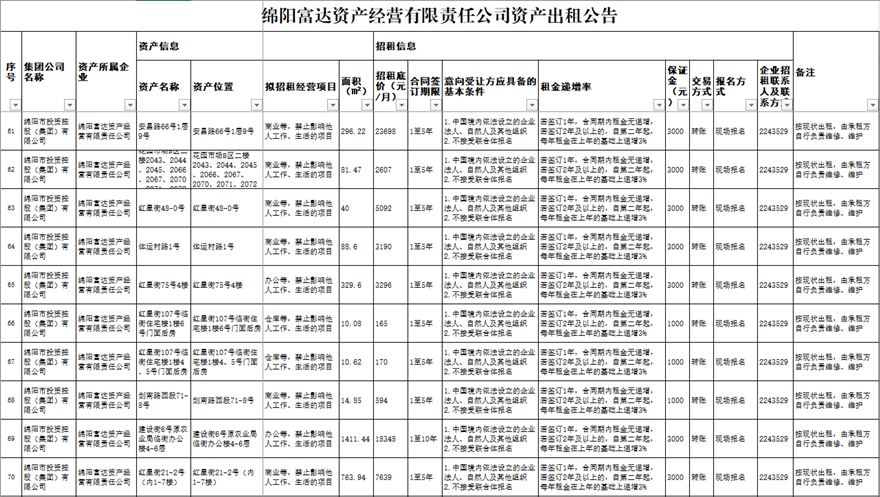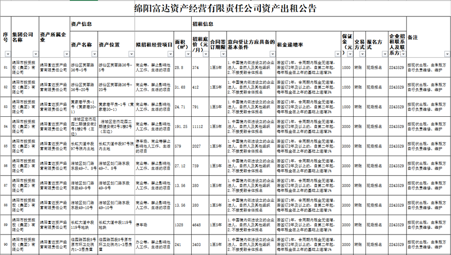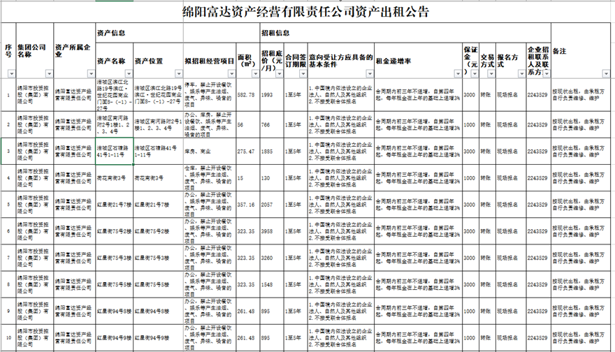 绵阳富达资产谋划有限责任公司资产出租通告