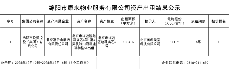 绵阳市康来物业效劳有限公司资产出租效果公示