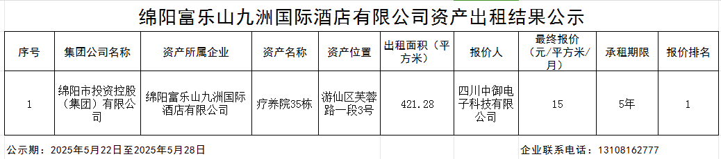 绵阳富乐山九洲国际旅馆有限公司资产出租效果公示
