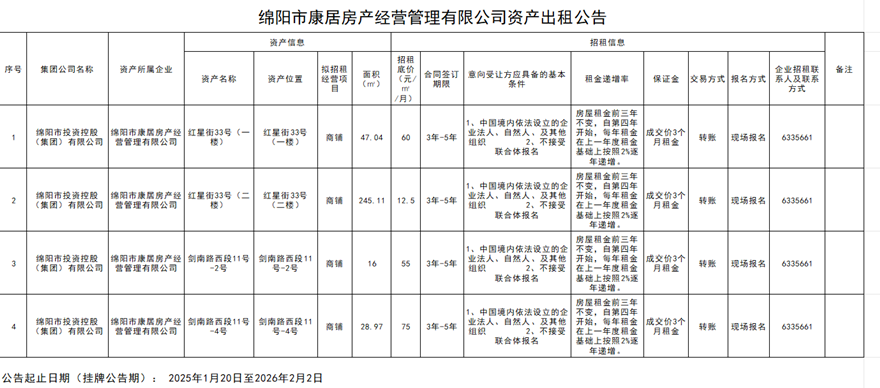 绵阳市康居房产谋划治理有限公司资产出租通告