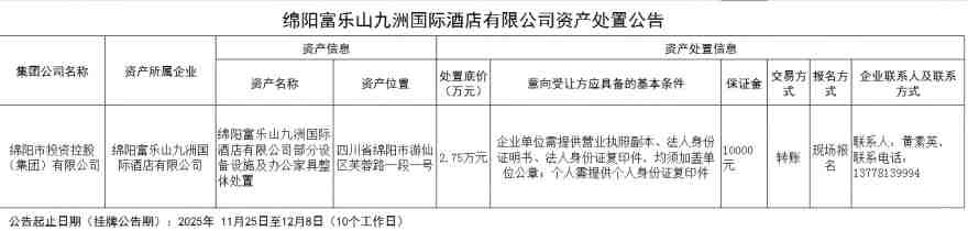 绵阳富乐山九洲国际旅馆有限公司资产处置惩罚通告