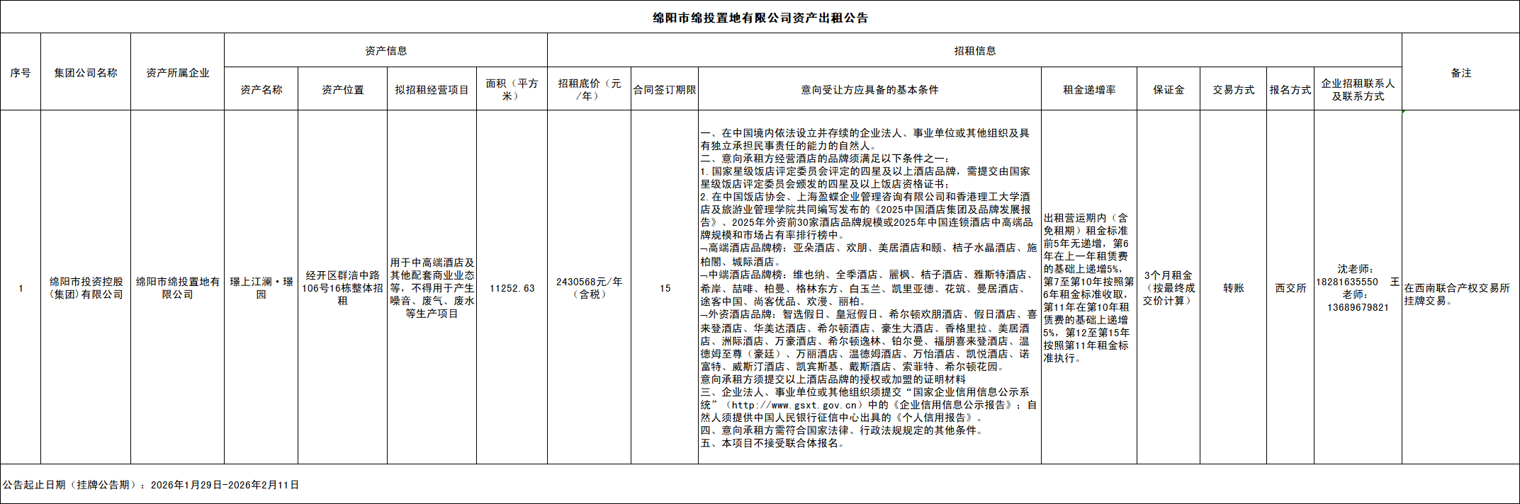 绵阳市BB电子·(china)有限公司官网置地有限公司资产出租通告