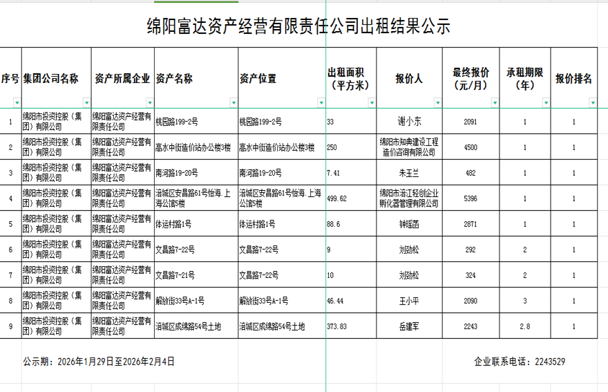 绵阳富达资产谋划有限责任公司资产出租效果公示