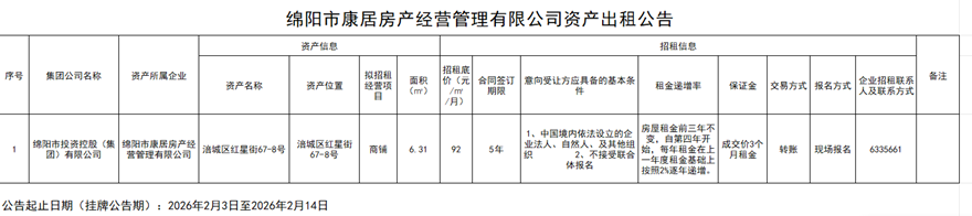 绵阳市康居房产谋划治理有限公司资产出租通告