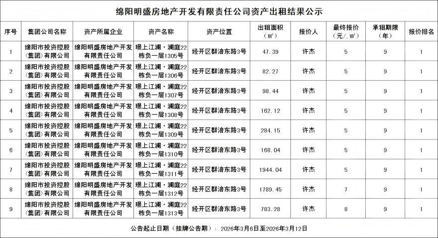 绵阳明盛房地产开发有限责任公司资产出租效果公示