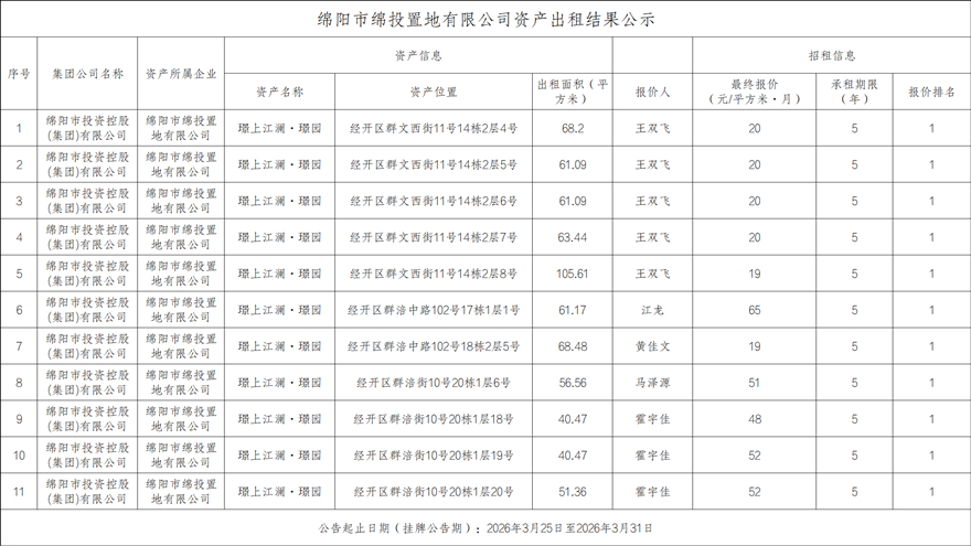 绵阳市BB电子·(china)有限公司官网置地有限公司资产出租效果公示
