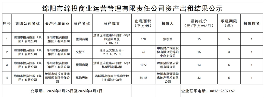 绵阳市BB电子·(china)有限公司官网商业运营治理有限责任公司资产出租效果公示