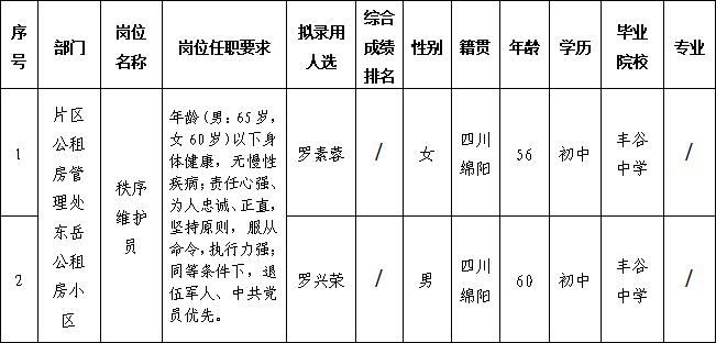 凭证康居公司宣布的恒久招聘一线勤杂职员的招聘通告相关划定,, ,,,,经面试、体检等程序,, ,,,,拟任命罗素蓉、罗兴荣同志到绵阳市康居房产谋划治理有限公司片区公租房治理处东岳公租房小区事情,, ,,,,现予以公示,, ,,,,详细情形如下: