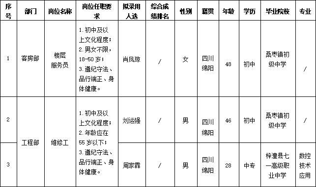 凭证绵阳市绵州嘉来会务效劳有限公司宣布的招聘通告及招聘相关划定,,,,,经面试、体检等程序,,,,,拟任命肖凤琼、刘运强、周家霖同志到客房部、工程部事情,,,,,现予以公示,,,,,详细情形如下: