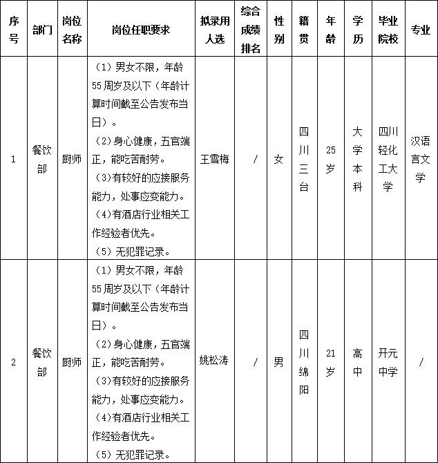 凭证绵阳市东津旅馆治理有限责任公司宣布的招聘通告及招聘相关划定,,,,,,通过面试等程序,,,,,,拟任命王雪梅等同志到餐饮部事情,,,,,,现予以公示,,,,,,详细情形如下: