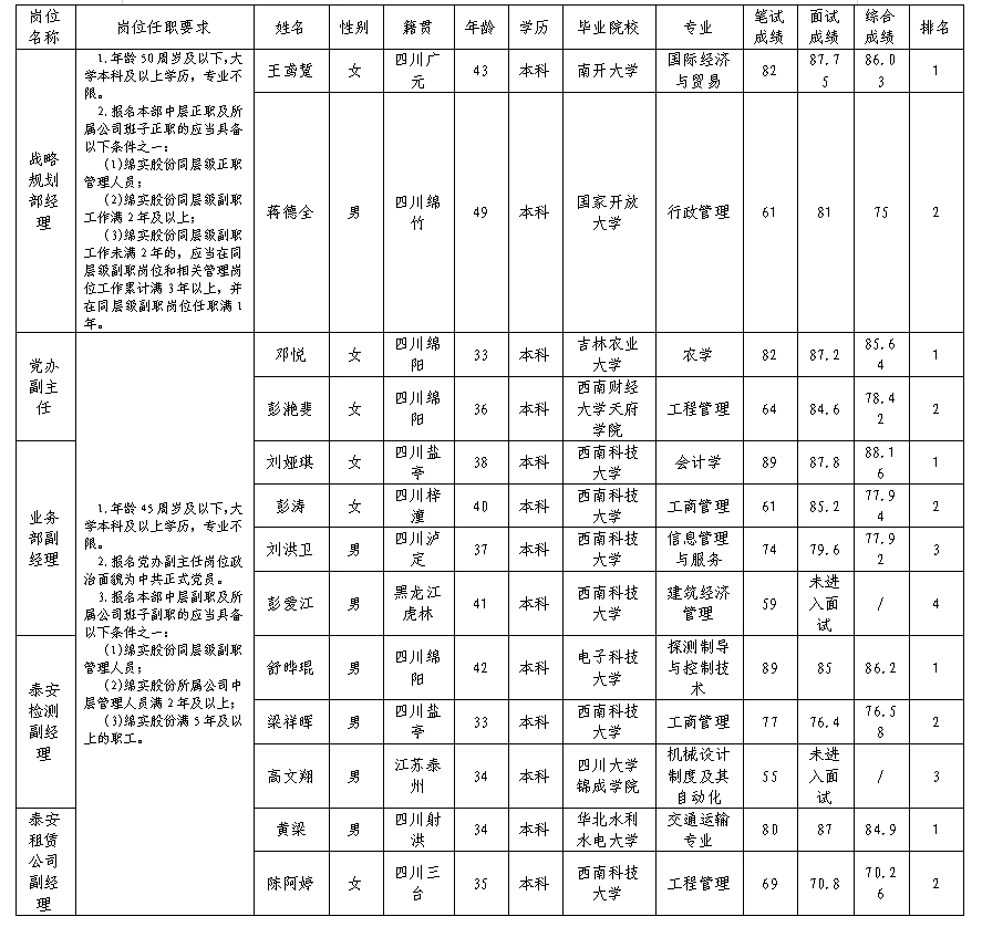 【内部竞聘】绵阳市汽车实验驾驶手艺学校股份有限公司 关于战略妄想部司理等岗位内部竞聘测试效果的公示