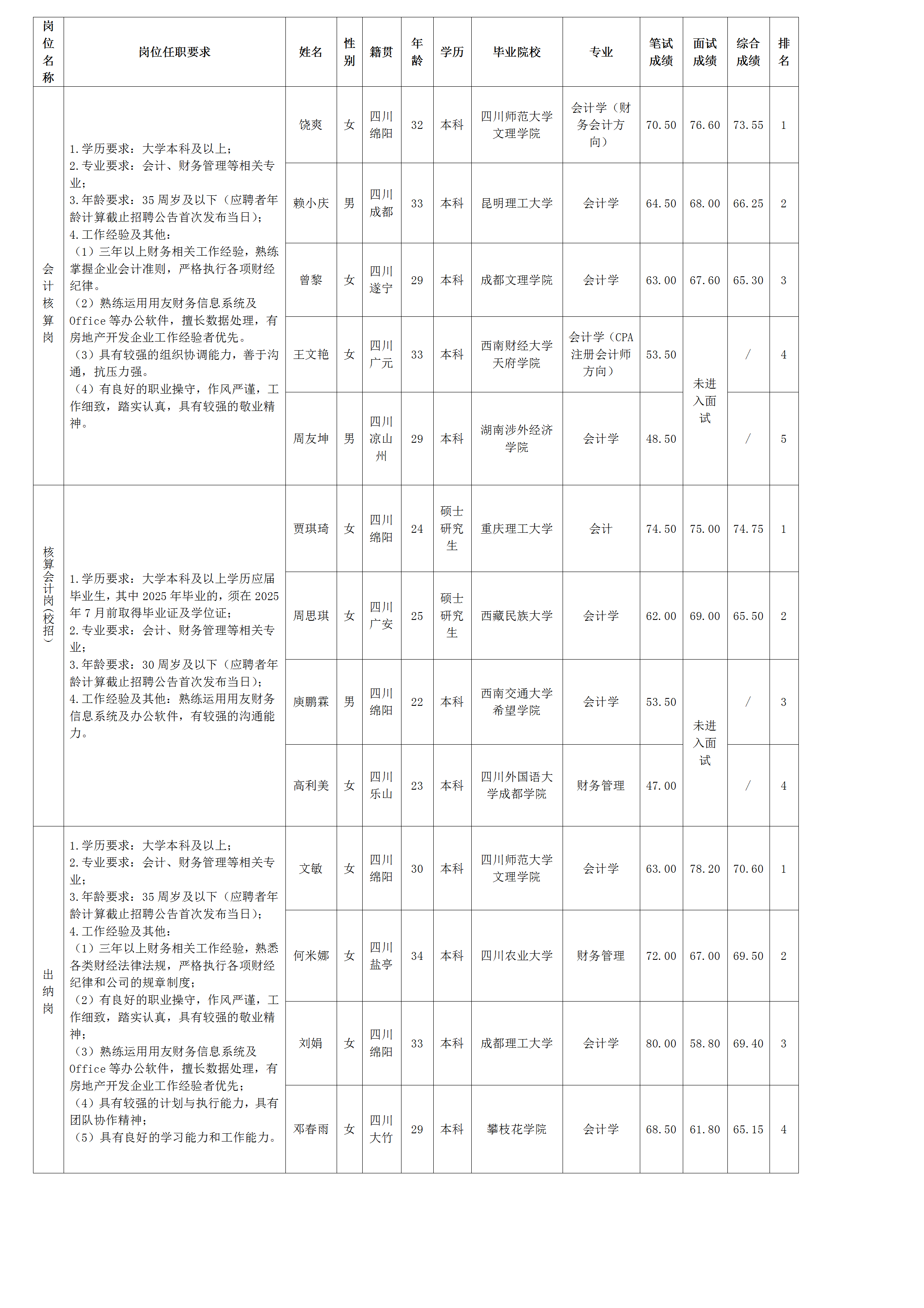 【果真招聘】绵阳市BB电子·(china)有限公司官网置地有限公司关于会计核算岗等岗位测试效果的公示