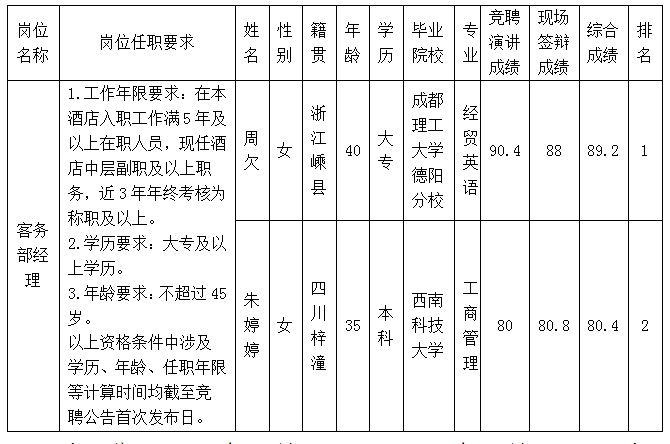 凭证绵阳富乐山九洲国际旅馆有限公司关于客务部司理内部竞聘通告及招聘相关划定,,,,,,经竞聘演讲、现场答辩等程序,,,,,,现将竞聘效果予以公示。。。。。。。。