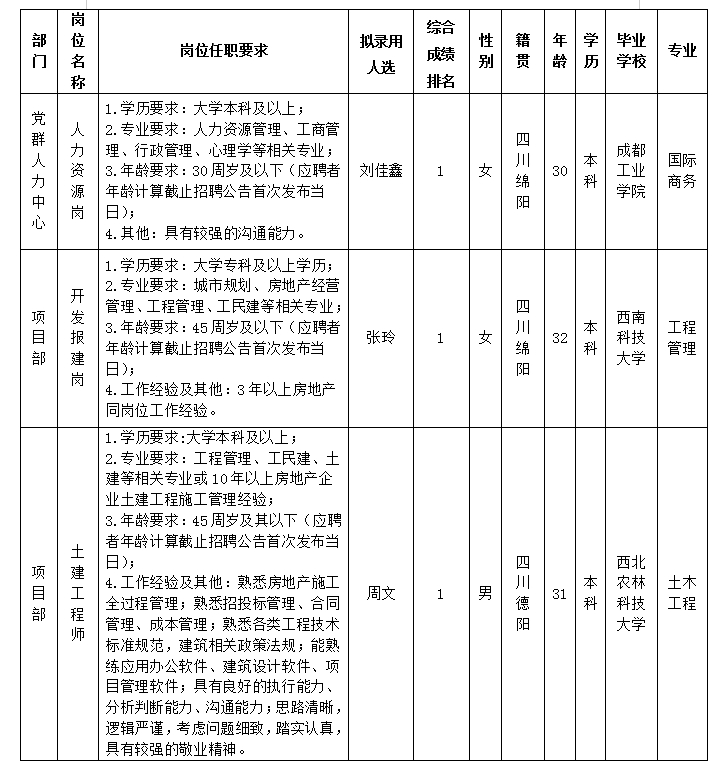 【果真招聘】绵阳市BB电子·(china)有限公司官网置地有限公司关于人力资源岗等岗位拟任命人选的公示