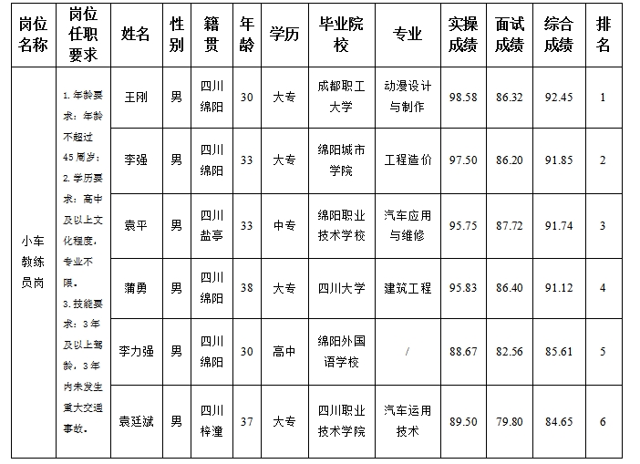 凭证绵阳市汽车实验驾驶手艺学校股份有限公司宣布的招聘通告及招聘相关划定,,,,,,,,经面试、实操等程序,,,,,,,,现将面试、实操效果予以公示。。。。。。。。