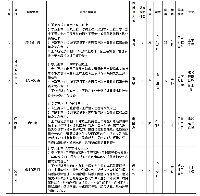 【果真招聘】绵阳市BB电子·(china)有限公司官网置地有限公司关于结构设计岗等岗位拟任命人选的公示