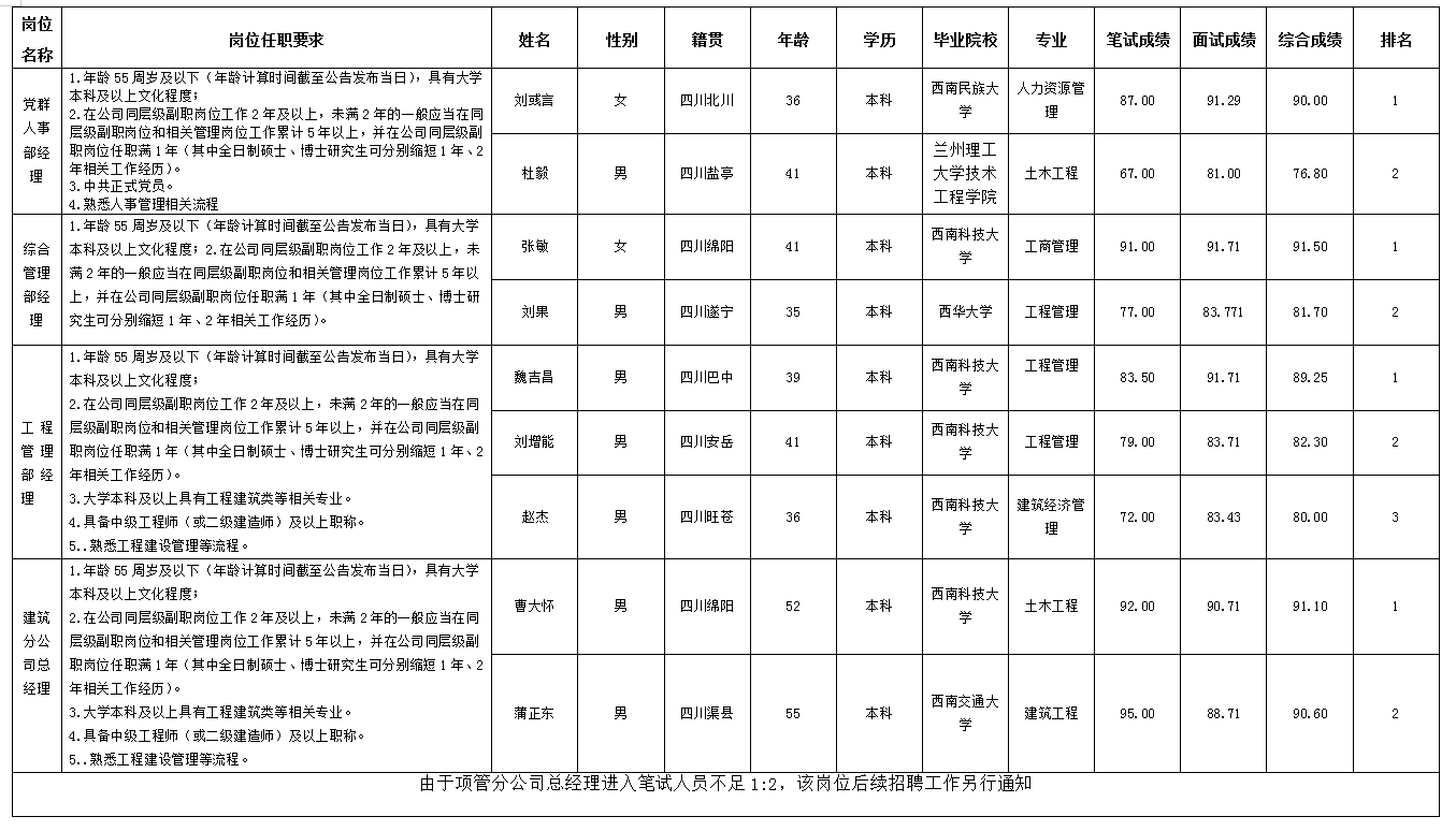 凭证四川嘉来修建工程有限公司宣布的中层竞聘通告及相关划定, ,,,,,经笔试、面试等程序, ,,,,,现将综合效果予以公示。。 。 。。。。