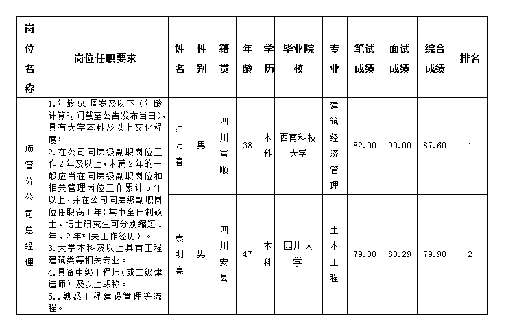 凭证四川嘉来修建工程有限公司宣布的延伸项目治理分公司总司理岗位报名时间的通告及相关划定,,,,,经笔试、面试等程序,,,,,现将综合效果予以公示。。。。。。。