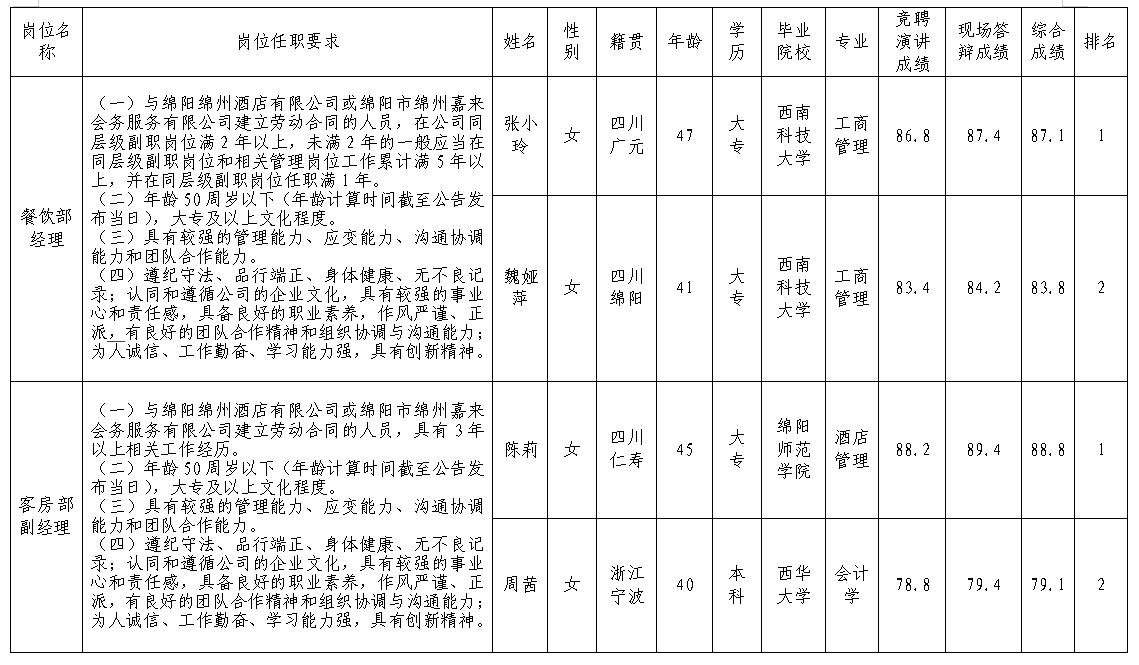 凭证绵阳绵州旅馆有限公司宣布的招聘通告及招聘相关划定,,,,,,经竞聘演讲、现场答辩等程序,,,,,,现将竞聘效果予以公示。。。。。。。