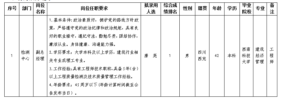 凭证绵阳富达资产谋划有限责任公司宣布的招聘通告及招聘相关划定,,,,,,经测试、考察、体检等程序,,,,,,拟任命唐亮同志到绵阳市建设工程质量检测中心有限责任公司工作,,,,,,现予以公示,,,,,,详细情形如下: