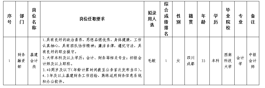 凭证绵阳富达资产谋划有限责任公司宣布的招聘通告及招聘相关划定,,,,,,,经笔试、面试、背调、体检等程序,,,,,,,拟任命毛敏同志到绵阳富达资产谋划有限责任公司工作,,,,,,,现予以公示,,,,,,,详细情形如下: