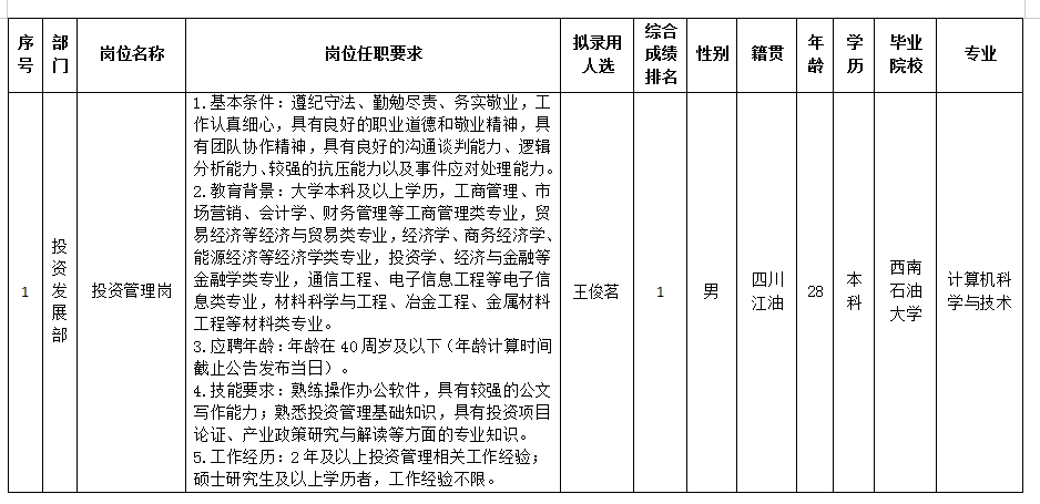 凭证绵阳绵太实业有限公司宣布的招聘通告及招聘相关划定,,,,,,,经笔试、面试、背调、体检等程序,,,,,,,拟任命王俊茗同志到绵阳绵太实业有限公司事情,,,,,,,现予以公示,,,,,,,详细情形如下: