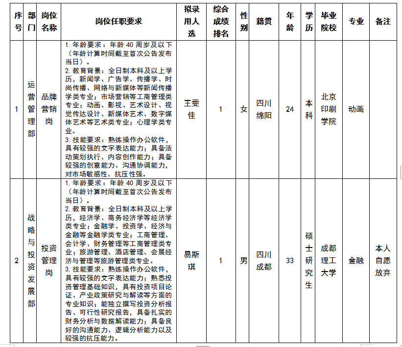 凭证绵阳文化旅游生长投资集团有限公司宣布的招聘通告及招聘相关划定,,,,,,,,经笔试、面试、背调、体检等程序,,,,,,,,拟任命王雯佳同志到绵阳文化旅游生长投资集团有限公司事情,,,,,,,,现予以公示,,,,,,,,详细情形如下: