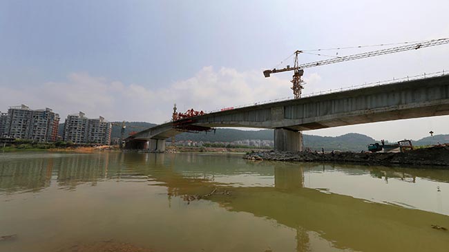 毗连桃花岛和沈家坝片区的虹云桥,,,,,是市政基础设施重点项目之一。。。。。。项目起于桃花岛,,,,,上跨涪江、芙蓉路,,,,,终点接绵盐路,,,,,桥梁全长497米。。。。。。其中主桥设计为83米+110米+83米三跨波形钢腹板一连梁;;;;;;;桥梁宽度18米,,,,,设计行车时速20公里。。。。。。项目建成通车后将增强城南片区与沈家坝片区的交通联系,,,,,改善桃花岛片区的出行条件,,,,,缓解涪江三桥的交通压力。。。。。。