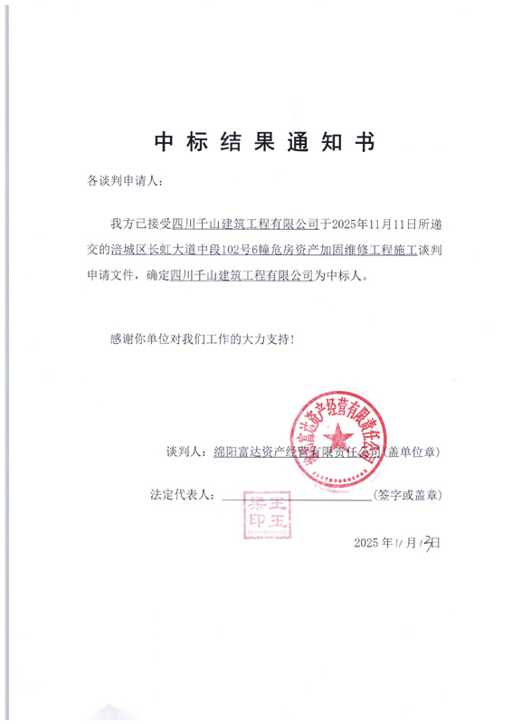 涪城区长虹大道中段102号6幢危房资产加固维修工程施工中标效果通知