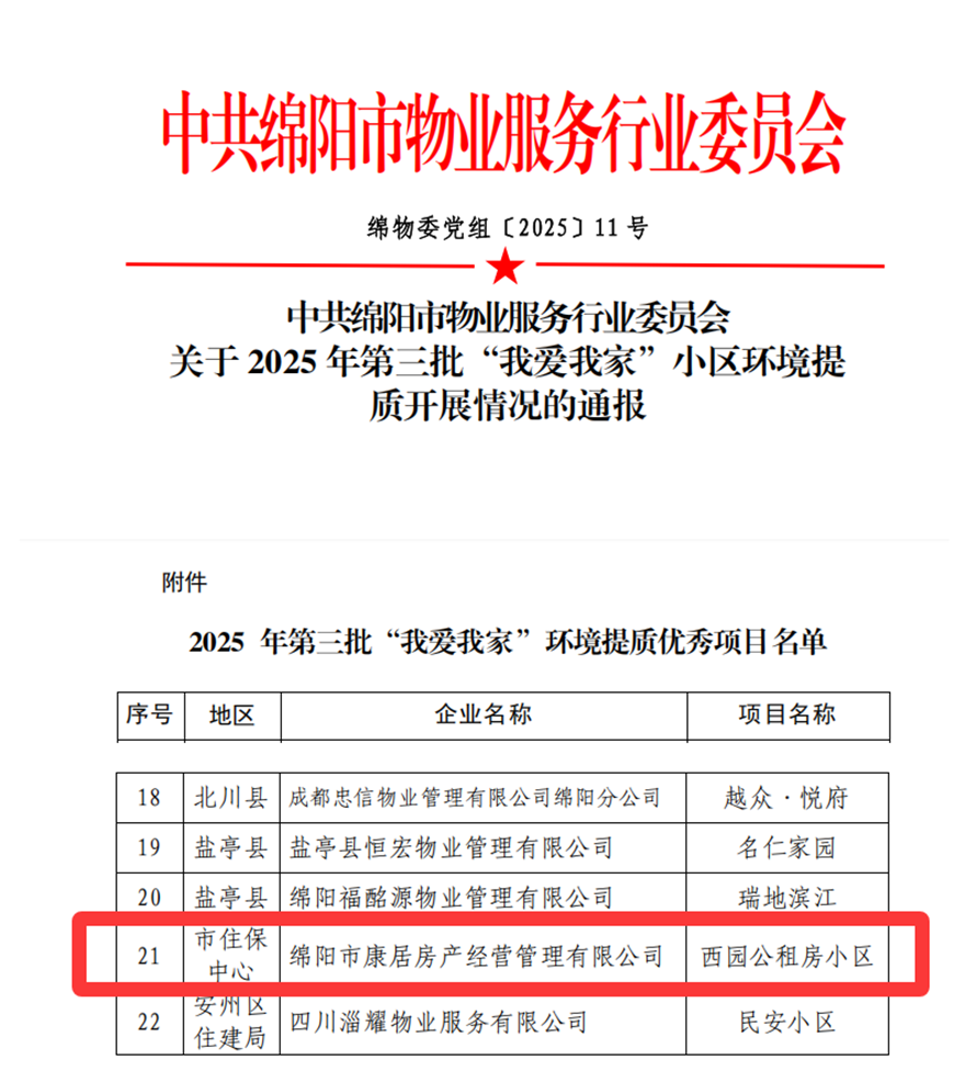 克日,,,,,绵阳市物业效劳行业协会转达表扬2025年第三批“我爱我家”小区情形提质优异项目,,,,,西园公租房小区榜上著名。。。。。效果的取得,,,,,是对康居公司践行“三心”效劳,,,,,即:以住户为焦点、与住户知心、让住户定心的有力佐证。。。。。