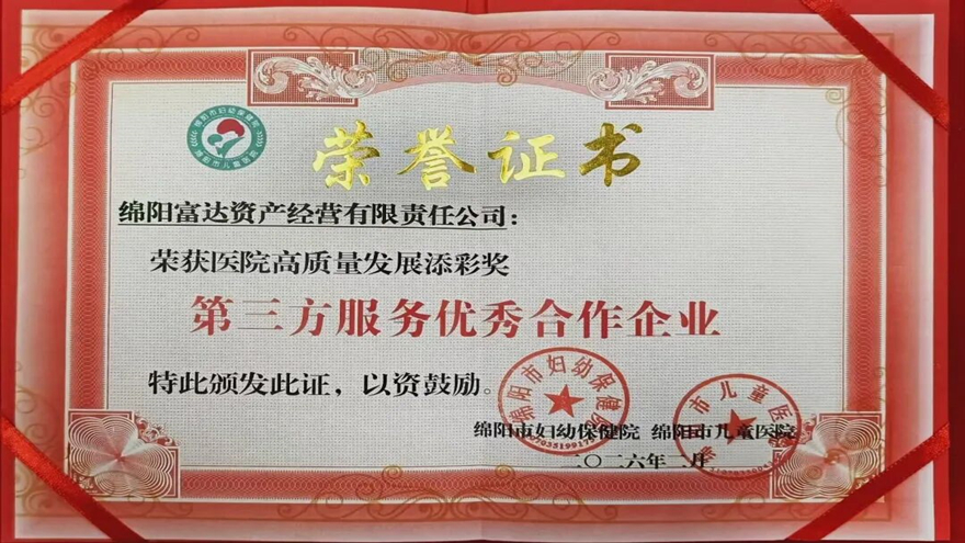 克日,,,,,绵阳富达资产谋划有限责任公司因代建市级重点民生项目 ——市妇幼保健院儿童医院二期及托育项目高效推进、效劳优质、建设有序,,,,,赢得业主方市妇幼保健院高度认可,,,,,获评 “第三方效劳优异相助企业”。。。。。。。