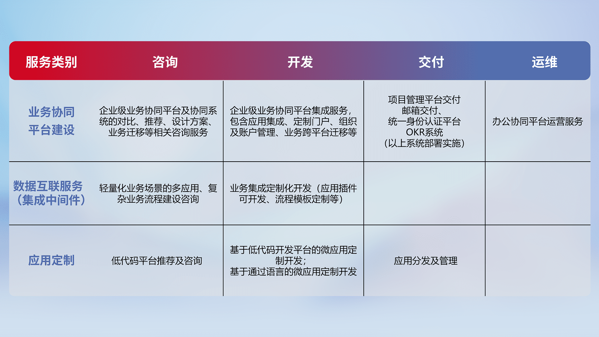 针对钉钉、、、企微、、、、IDaas等平台级产品提供产品的规划、、、、方案、、、、交付、、定制化开发等服务,,,,实现如统一协同办公、、智能客户服务、、、、混合会议管理、、、、智能数据查询、、等业务场景,,实现数字化转型。。。。